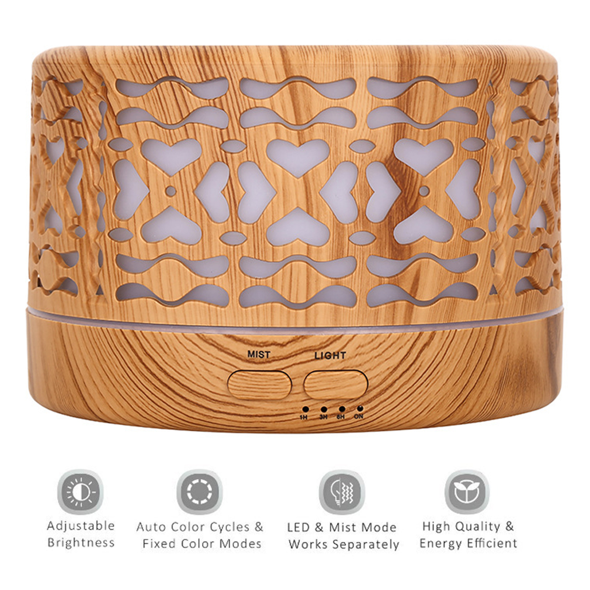 Les diffuseurs domestiques Wild Essentials sont la solution parfaite pour diffuser dans des pièces de toutes tailles. Notre diffuseur de 700 ml a une finition en bois clair avec un motif en forme de cœur gravé sur le côté de la coque, et des lunes et des étoiles sur le dessus. Il est également livré avec une télécommande, fonctionne sur secteur et comprend un diffuseur d'aromathérapie/huiles essentielles, un humidificateur, un vaporisateur, un assainisseur d'air et une veilleuse multicolore, le tout en un ! Il suffit de remplir le réservoir d'eau avec jusqu'à 700 ml d'eau (environ 3 tasses) et quelques gouttes de votre huile essentielle ou de votre parfum préféré pour un maximum de 20 heures d'utilisation ! Notre diffuseur domestique a un cycle de fonctionnement très silencieux (moins de 25 dB) et utilise la technologie de fréquence ultrasonique de 2,4 MHz. Notre diffuseur est doté d'une veilleuse LED de 7 couleurs différentes en modes clair et faible. Vous pouvez donc le conserver sur votre couleur préférée