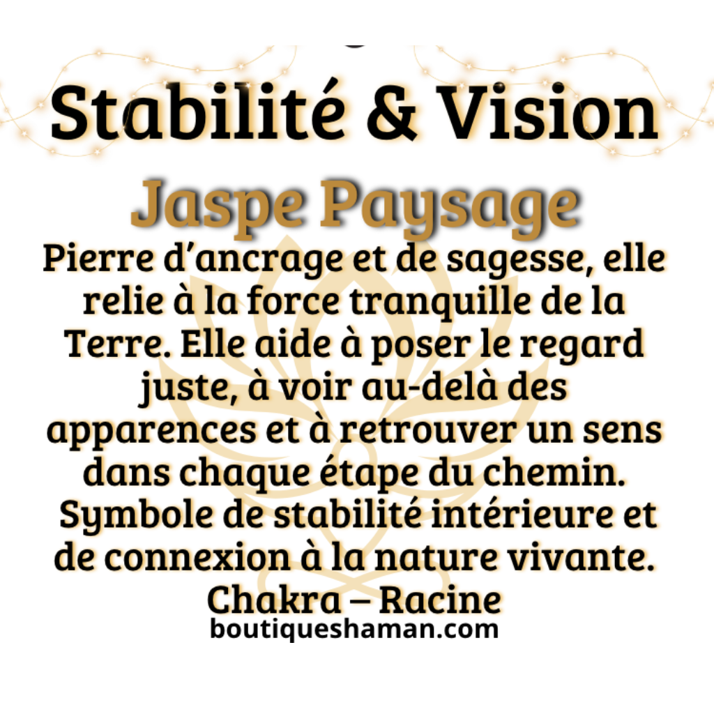 Pierre d’ancrage et de sagesse, elle relie à la force tranquille de la Terre. Elle aide à poser le regard juste, à voir au-delà des apparences et à retrouver un sens dans chaque étape du chemin.