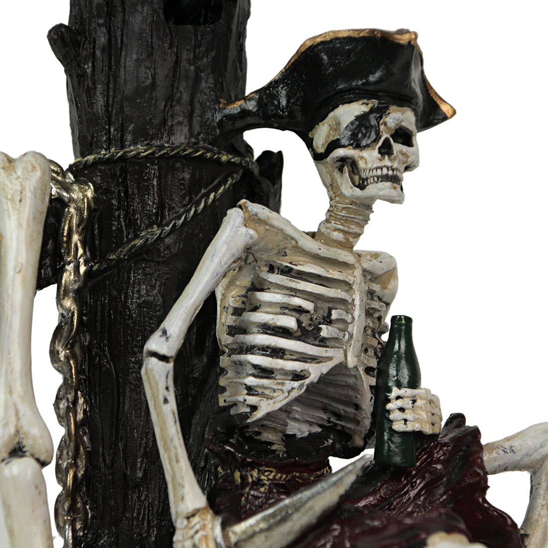 Cette superbe lampe de table représente le squelette d'un pirate naufragé au sommet d'un coffre au trésor, le bois du navire servant de base à la lampe. Mesurant 21 pouces de haut, abat-jour de 13 pouces de diamètre compris, la lampe est un merveilleux accent décoratif pour les amateurs de pirates ou pour toute pièce sur le thème des Caraïbes ou du nautisme. Fabriquée en résine moulée à froid robuste avec un abat-jour en forme de carte au trésor des pirates, cette lampe est prête à naviguer en haute mer avec style. Cette lampe est homologuée UL, elle utilise une ampoule de type A de 60 W (non incluse) et dispose d'un cordon d'alimentation de 53 pouces avec un interrupteur à bascule intégré.